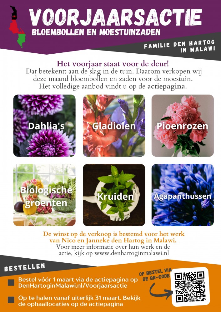 Deze maand kunt u verschillende soorten bloembollen en moestuinzaden bestellen, waarbij de winst op de verkoop bestemd is voor het werk van familie Den Hartog voor Stéphanos in Malawi. Alle bollen en zaden zijn afkomstig van firma Chr. de Leeuw uit Hagestein. Bestellen kan via de actiepagina op de website: https://www.denhartoginmalawi.nl/voorjaarsactie. We ontvangen uw bestelling graag uiterlijk D.V. 29 februari, dan kan deze naar verwachting eind maart worden opgehaald bij één van de ophaallocaties.